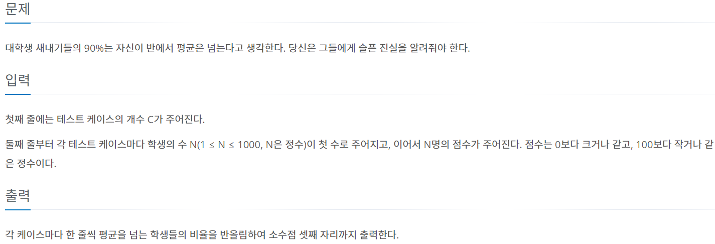 어제에 이어 리스트 + 반복문 뿌시기다. 이번 문제중 4344번이 진짜 너무나도 오래걸렸다...