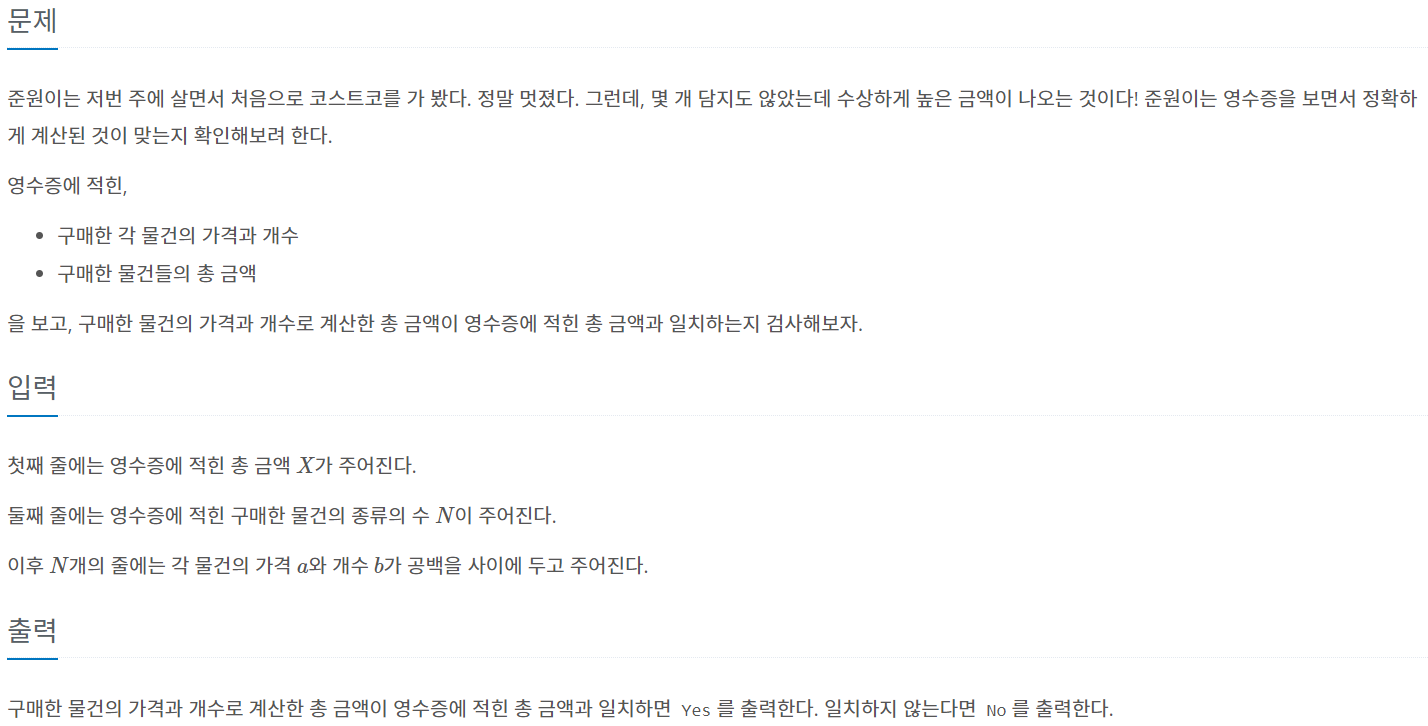 각각의 물건 총 값을 더해 기존 입력 받은 총금액과 일치하는지 알아보면된다.