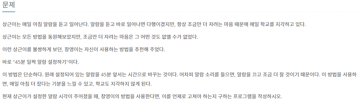 입력된 시간보다 45분이 단축되어 표시해줘야하는데... 주어진 분이 45분 이상이면 시간은 줄어들지 않지만 45분 미만이면 시간은 -1되어 나타나야한다. 따라서 이를 가지고 IF문을 걸어줬으며 이에 따른 출력 분에는 +15 시켜줬다.