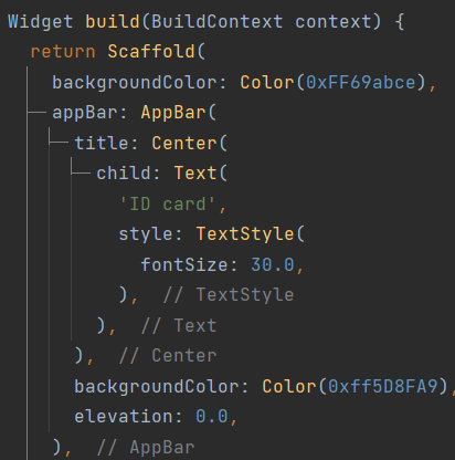 hex코드는 Color(0xFF-------) 이렇게 사용하면 된다. 3번째줄의 색 코드는 앱 전체 배경색이고